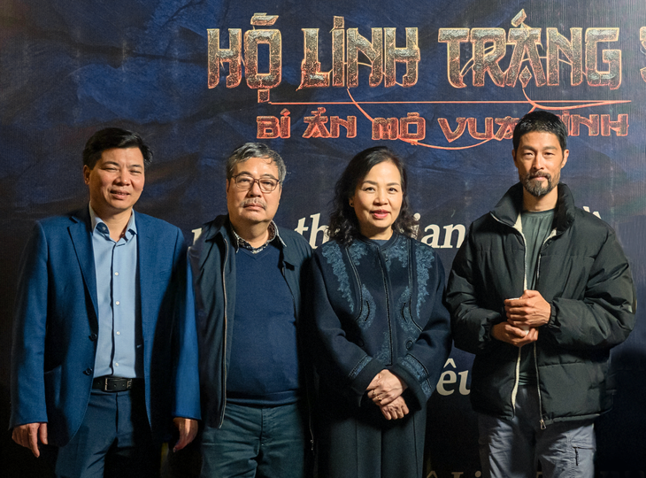 (Từ trái qua) Ông Nguyễn Mạnh Cường - Phó giám đốc Sở Văn hóa và Thể thao Ninh Bình; ông Đinh Trọng Tuấn, thành viên Ban Chấp hành VFDA; bà Ngô Phương Lan và diễn viên - đạo diễn hành động Johnny Trí Nguyễn - Ảnh: ĐPCC