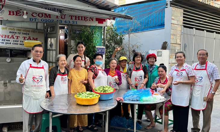 Hoa hậu Lương Thùy Linh và các thành viên Câu lạc bộ từ thiện Nhất Tâm chuẩn bị nấu ăn - Ảnh: NVCC