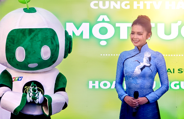 Hoa hậu Ngọc Châu chia sẻ trong chương trình rằng mình vinh dự khi nhận vai trò Đại sứ xanh HTV 2026, đồng hành cùng cộng đồng trong việc kêu gọi bảo vệ môi trường, sống xanh - Ảnh: HOÀNG LÊ