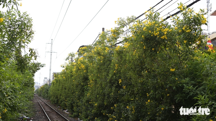 Hàng cây hoa huỳnh liên được trồng nối tiếp nhau dọc hai bên đường ray nở vàng tại phường Phú Nhuận