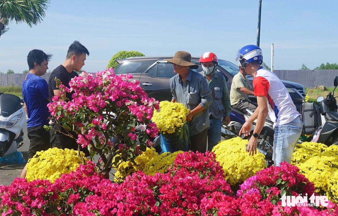 Người dân lựa chọn mua hoa giấy, hoa cúc mâm xôi giảm giá về chưng Tết - Ảnh: CHÍ CÔNG