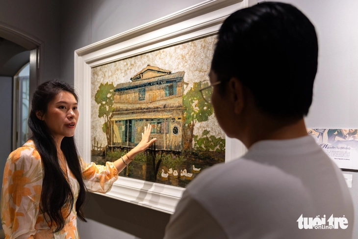 Họa sĩ giới thiệu về tranh tại triển lãm "Mùa di cư" - Ảnh: VĂN TRUNG