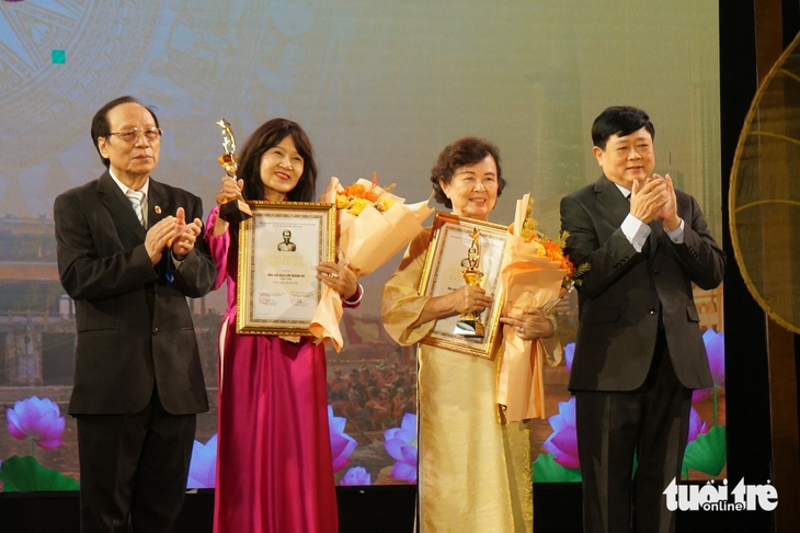 Nghệ sĩ Trần Tựa (bìa phải) nhận giải Ca sĩ xuất sắc, họa sĩ Lê Sa Long (thứ 2 từ trái qua) nhận giải Họa sĩ xuất sắc - Ảnh: T.ĐIỂU