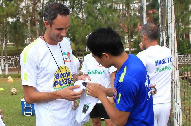 | HLV Anthony trao tận tay từng cầu thủ chiếc áo tập luyện có gắn chip điện tử trước buổi tập. Ảnh: MINH TRẦN |