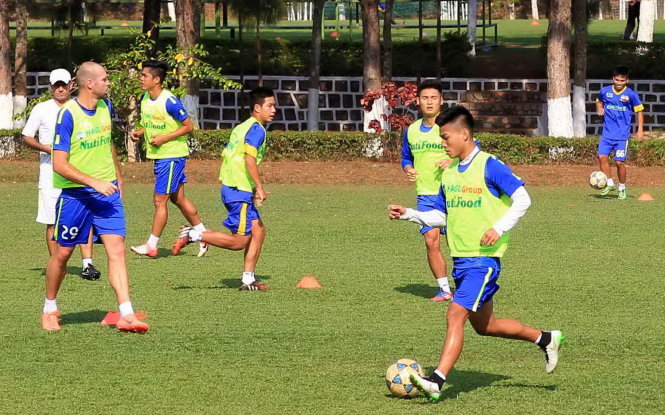 | Buổi tập được tiến hành sau lúc từng cầu thủ mặc áo gắn chip điện tử. Ảnh: MINH TRẦN |