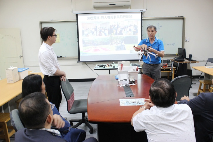 Tiến sĩ Lâm Kim Tuấn - Phó chủ nhiệm khoa khoa học máy tính và kỹ thuật thông tin Học viện Kỹ thuật Nam Á - giới thiệu về đào tạo máy bay không người lái với lãnh đạo Trường CĐ Kinh tế đối ngoại Việt Nam và Trường THPT Nhân Văn (TP.HCM) khi đoàn đến thăm trường này giữa tháng 4-2026. Học viện Kỹ thuật Nam Á hiện có 120 sinh viên Việt Nam theo học, trong đó có 77 sinh viên hệ vừa học vừa làm - Ảnh: HÀ BÌNH