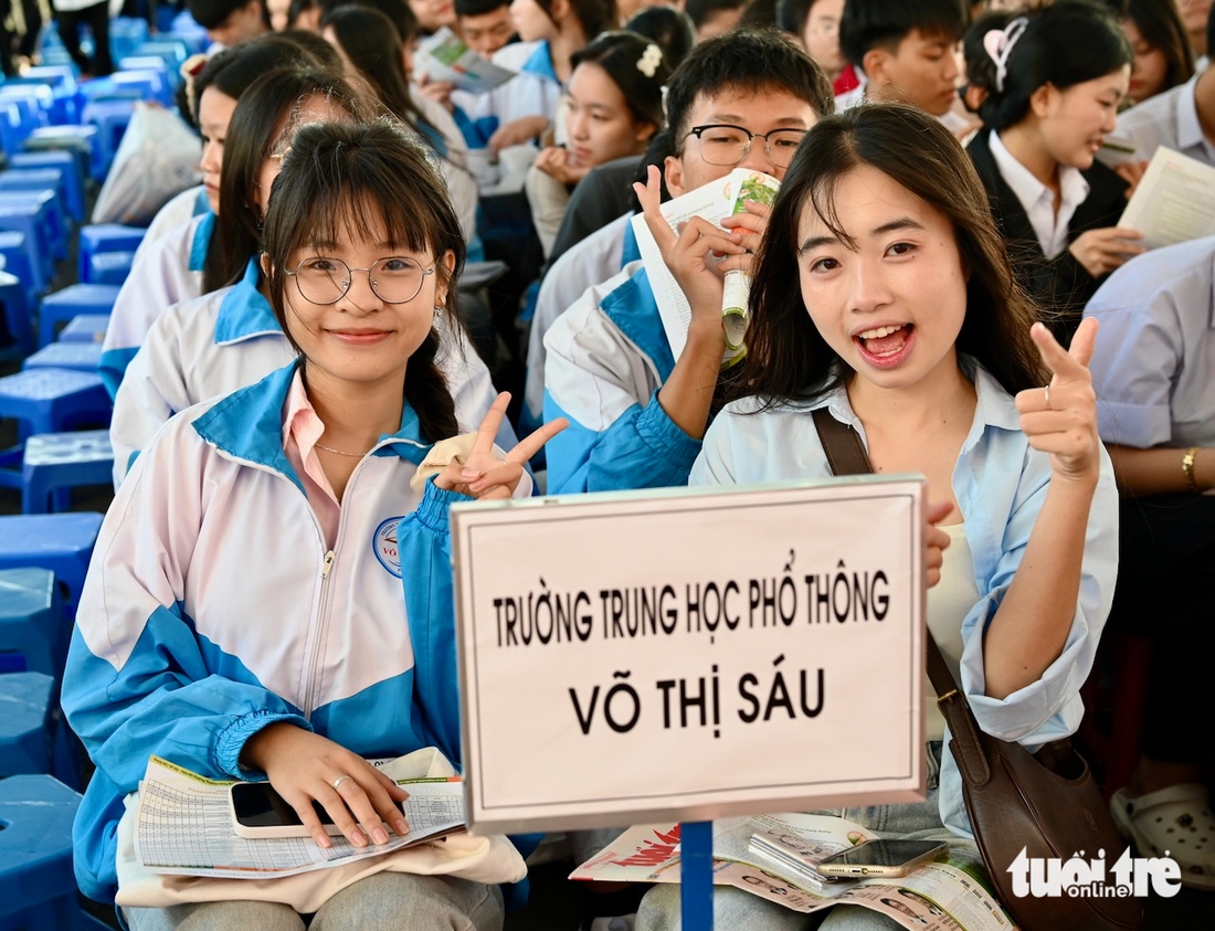 Các em học sinh Trường THPT Võ Thị Sáu đến tham dự chương trình từ sớm - Ảnh: MINH CHIẾN