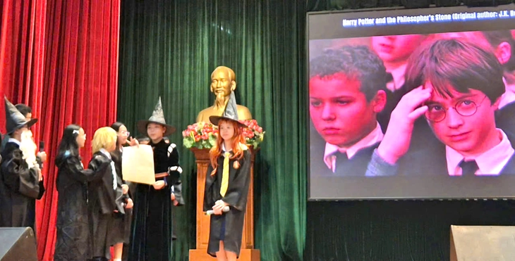 Học sinh lớp 6A1 Trường THCS-THPT Trần Đại Nghĩa hóa trang thành những nhân vật trong phim Harry Potter - Ảnh: H.H.