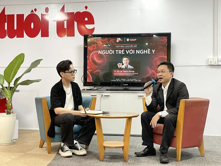 Bạn Quang Hùng (bên trái) - sinh viên năm hai khoa quan hệ công chúng - đảm nhận trực tiếp vai trò MC trong buổi họp báo, trò chuyện cùng bác sĩ Lê Thanh Phong - Ảnh: HỒ NHƯỠNG