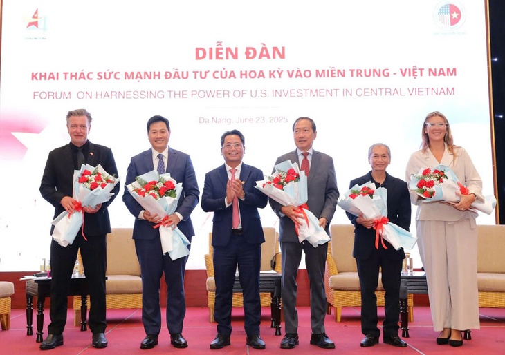 Anh Lê Trí Hải (thứ 3 trái qua) tặng hoa các diễn giả, đại biểu tham dự diễn đàn thu hút đầu tư của Mỹ vào miền Trung - Ảnh: DNT
