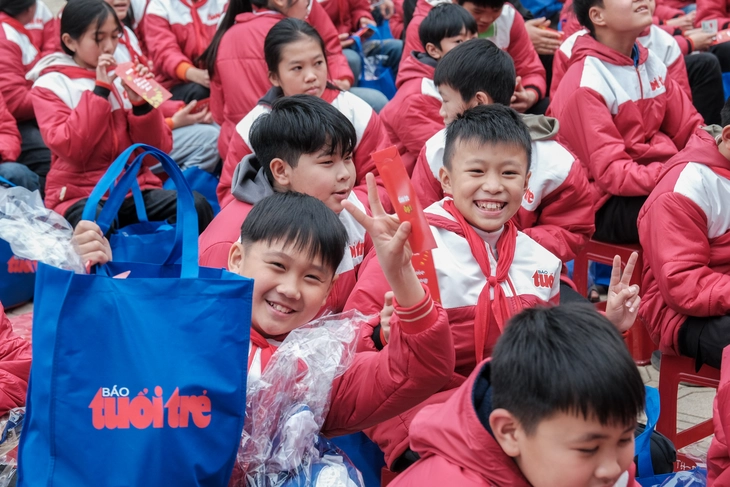 Học sinh vùng cao Cao Bằng nhận quà Tết, lì xì, áo ấm của chương trình "Tết sẻ chia" - Ảnh: HÀ QUÂN