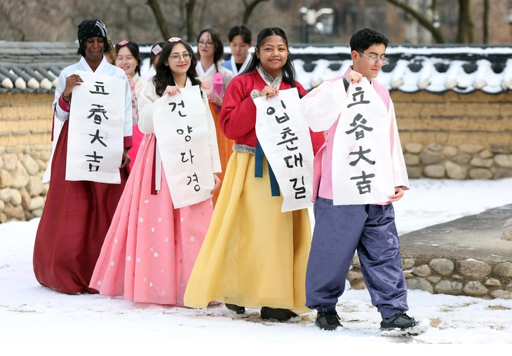 Người nước ngoài mặc hanbok, trang phục truyền thống của Hàn Quốc, cùng những câu chúc chào đón mùa xuân tại thành phố Gyeongsan, tỉnh Bắc Gyeongsang ngày 2-2 - Ảnh: YONHAP