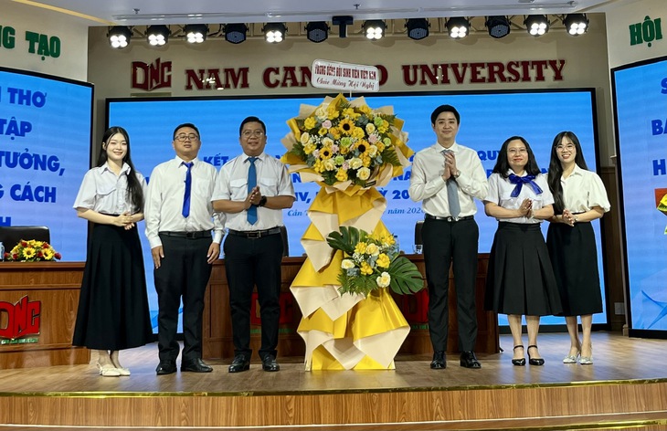 Anh Lâm Tùng - Phó chủ tịch thường trực Trung ương Hội Sinh viên Việt Nam (thứ ba từ phải sang) tặng hoa chúc mừng Hội Sinh viên Việt Nam TP Cần Thơ - Ảnh: LAN NGỌC