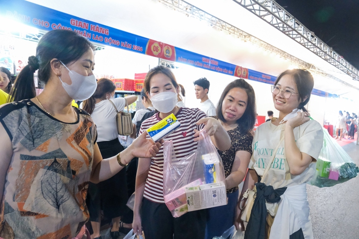 Đoàn viên công đoàn mừng rỡ khi được mua hàng giảm giá nhưng chất lượng tốt tại gian hàng dành cho công nhân lao động ở Bắc Ninh - Ảnh: HÀ QUÂN