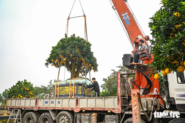 Từ sáng sớm, ông Thủy (chủ nhà vườn Hoàng Chính) cùng 2 người làm tất bật chuẩn bị cẩu cây bưởi cảnh hàng chục năm tuổi lên chiếc xe tải hạng nặng.