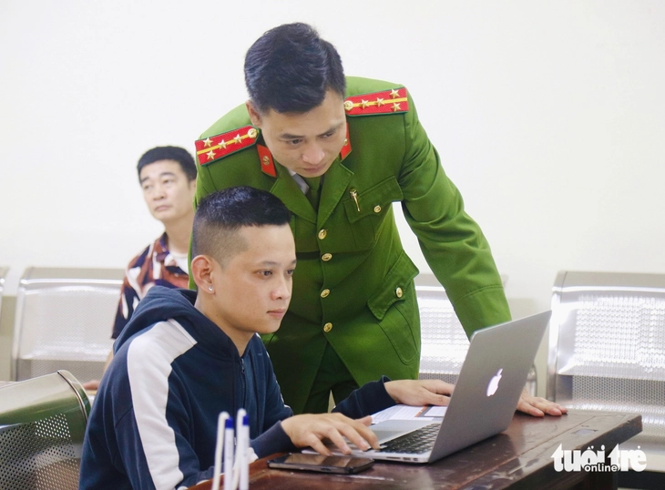 Cán bộ công an hướng dẫn người dân thực hiện một số thủ tục hành chính - Ảnh: DANH TRỌNG