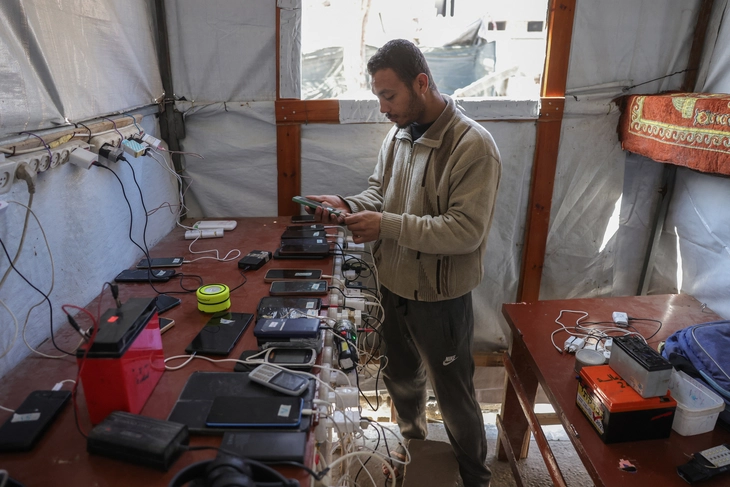 Một ông chủ người Palestine vận hành điểm sạc điện thoại dã chiến trong lều tại khu trại sơ tán phía tây thành phố Jabalia, miền bắc Dải Gaza, ngày 11-3 - Ảnh: AFP