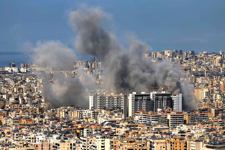 Khói bốc lên nghi ngút sau các cuộc tấn công được cho vào vùng ngoại ô phía nam Beirut, sau sự leo thang căng thẳng giữa Hezbollah và Israel - Ảnh: REUTERS