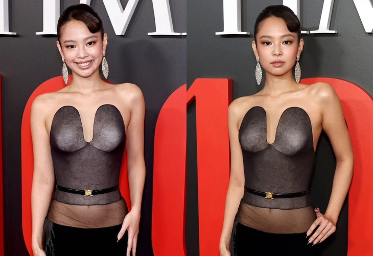 Tại thảm đỏ, Jennie xuất hiện với phong cách thời trang gây chú ý khi lựa chọn trang phục của thương hiệu Schiaparelli. Cô diện một chiếc váy đen với thiết kế corset nổi bật, khoét ngực táo bạo. Đặc biệt phần hông được thêm chất liệu xuyên thấu, nhẹ nhàng tôn lên vòng eo thon gọn.