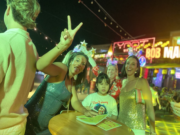 Nhóm khách nước ngoài vui mừng chờ đợi thời khắc giao thừa ở Hội An tối 31-12 - Ảnh: B.D.