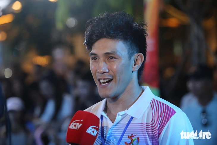 Vận động viên muay Nguyễn Trần Duy Nhất trả lời phỏng vấn trước lễ khai mạc - Ảnh: Đức Khuê