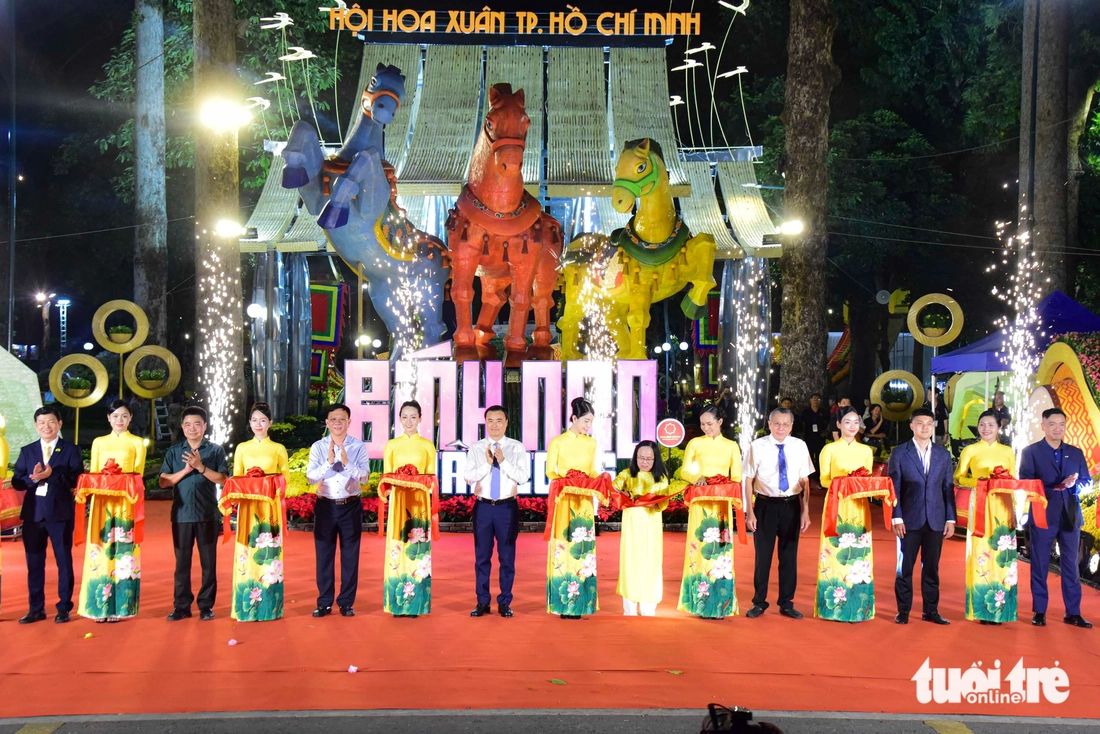Các đại biểu thực hiện nghi thức khai mạc Hội hoa xuân TP.HCM tại công viên Tao Đàn tối 12-2. Phía sau là ba linh vật ngựa nổi bật - một trong những điểm nhấn của Hội hoa xuân năm nay