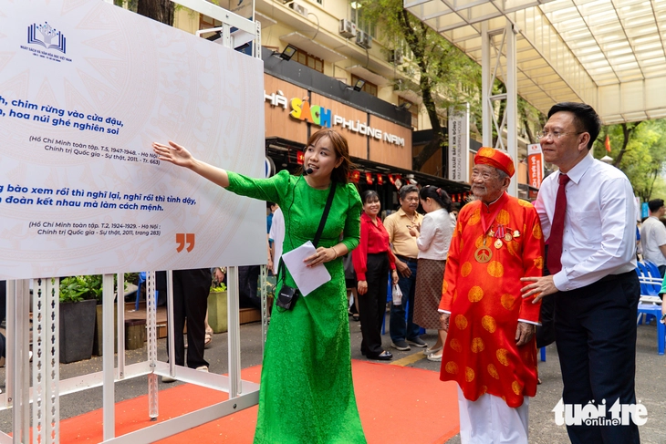 Nhà nghiên cứu Nguyễn Đình Tư (áo dài) dự lễ khai mạc Ngày Sách và văn hóa đọc Việt Nam - Ảnh: VĂN TRUNG