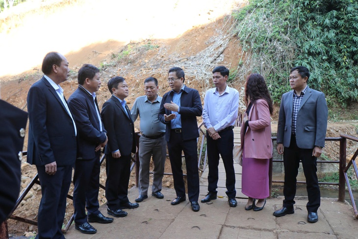 Ông Nguyễn Hoàng Giang (thứ 4 từ phải sang), Chủ tịch UBND tỉnh Quảng Ngãi, kiểm tra hiện trường thác Pa Sỹ - Ảnh: TRẦN MAI
