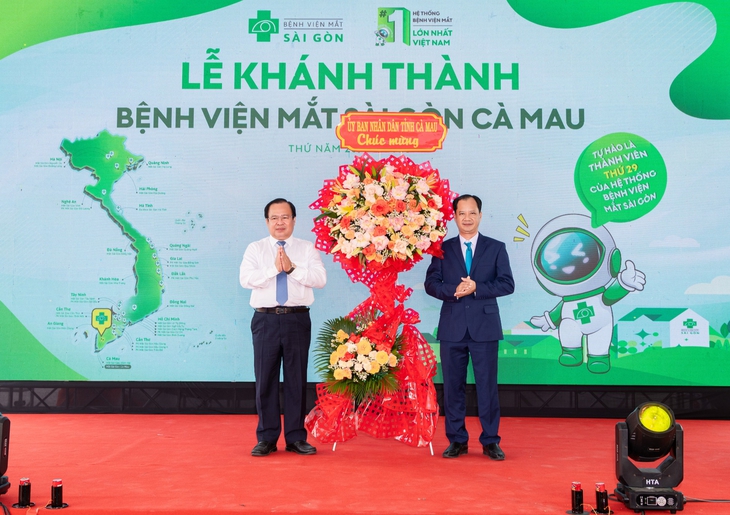 Phó Chủ tịch UBND tỉnh Nguyễn Minh Luân (trái) tặng hoa chúc mừng lễ khánh thành Bệnh viện Mắt Sài Gòn Cà Mau đến ông Nguyễn Duy Khánh, giám đốc điều hành Bệnh viện - Ảnh: ĐTCC