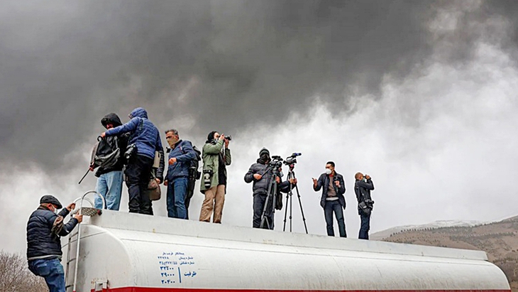 Các phóng viên đứng trên một chiếc xe bồn nhiên liệu để tác nghiệp, ghi lại cảnh đám cháy gần đó sau cuộc không kích vào đêm trước nhằm vào Nhà máy lọc dầu Shahran ở phía tây bắc Tehran, ngày 8-3-2026 - Ảnh: AFP