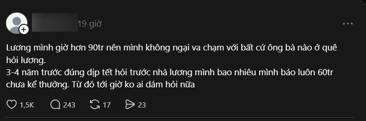 Mới đây, trên mạng xã hội Thread, một bạn trẻ chia sẻ cách “phản kháng” của mình ngày Tết: thẳng thắn công khai mức lương 60 triệu đồng/tháng cách đây vài năm chưa kể thưởng, hiện tại đã hơn 90 triệu đồng/tháng. “Từ đó tới giờ không ai dám hỏi nữa”, người này viết.