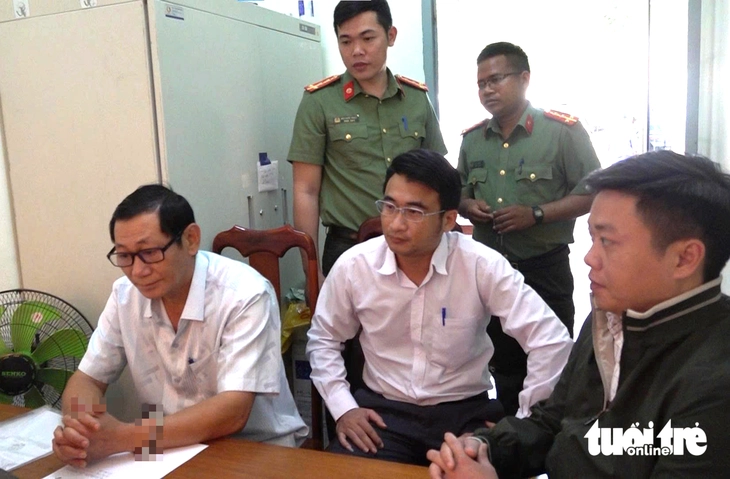 Ông Hậu (ngoài cùng, bên trái) làm việc với Cơ quan an ninh điều tra và đã bị khởi tố về hành vi làm trái quy định về đấu thầu - Ảnh: HOÀNG MINH