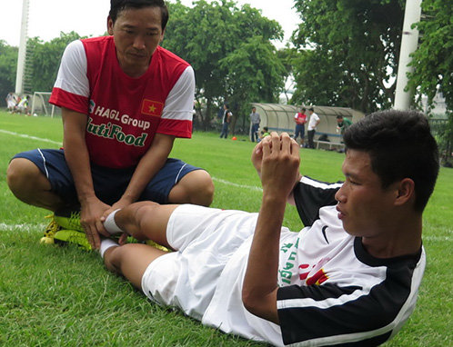 | Bác sĩ Đồng Xuân Lâm giúp trung vệ Đông Triều tập hồi phục chấn thương - Ảnh: S.H. |