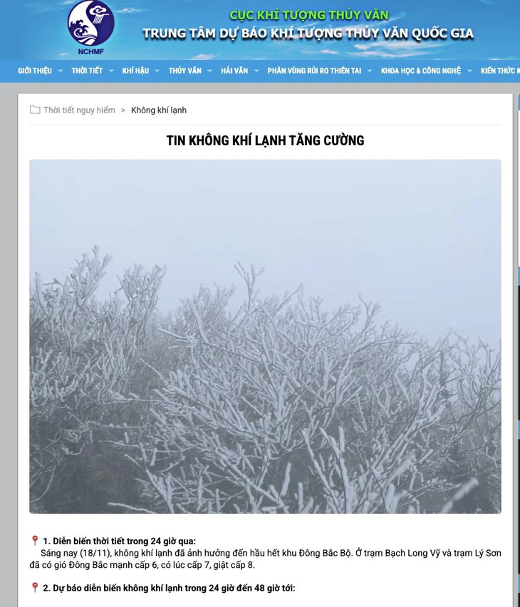Tin không khí lạnh tăng cường được phát đi bởi Trung tâm Dự báo khí tượng thủy văn quốc gia lúc 9h30 sáng ngày 18-11 - Ảnh: DNCC