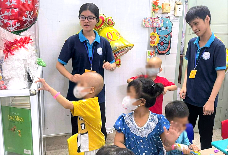 Tô Chí Đỉnh (bên phải) hỗ trợ các bệnh nhi ở phòng sinh hoạt của trẻ tại khoa ung bướu huyết học Bệnh viện Nhi đồng 2 - Ảnh: NVCC