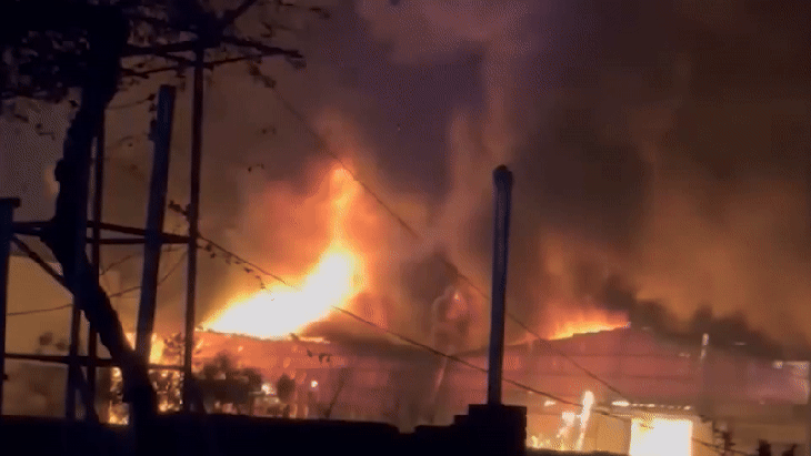 Lúc 0h10, ngọn lửa tiếp tục bùng lên nhanh trên diện tích hàng trăm mét vuông. Nhân chứng tại hiện trường cho biết khu xưởng này có kết cấu chủ yếu bằng tôn, khung sắt. Nhiều kết cấu bị đổ sập do sức nóng lớn.