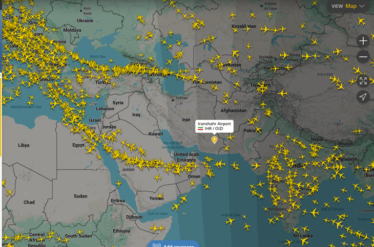 Dữ liệu trang theo dõi chuyến bay thời gian thực FlightRadar24 cho thấy không phận Iran, Iraq, Syria... vắng bóng máy bay thương mại ngày 9-3 - Ảnh: TUẤN PHÙNG chụp lại