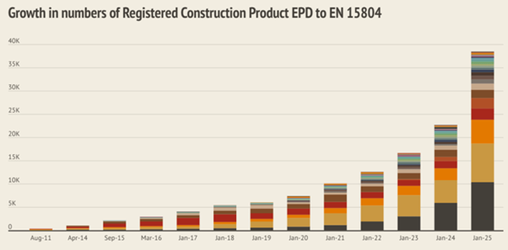 Theo thống kê của Công ty tư vấn ConstructionLCA, đã có hơn 38,000 bộ EPD được công bố tính đến tháng 1-2025, chứng tỏ sự tăng trưởng của xu hướng này trong ngành xây dựng.