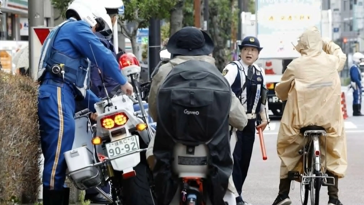 Một người đi xe đạp bị cảnh sát chặn lại tại thủ đô Tokyo vào ngày 2-4 - Ảnh: KYODO