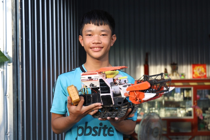 Giọng Huy đặc sệt kiểu người miền Tây khoe: "Em coi trên mạng, thấy người ta làm hay quá nên em bắt chước. Mấy cái này là thùng mì gói em xin được, còn mấy cái mạch điện, mô tơ em gỡ trong đồ chơi hư hoặc xin tiền ba mua đồ cũ".