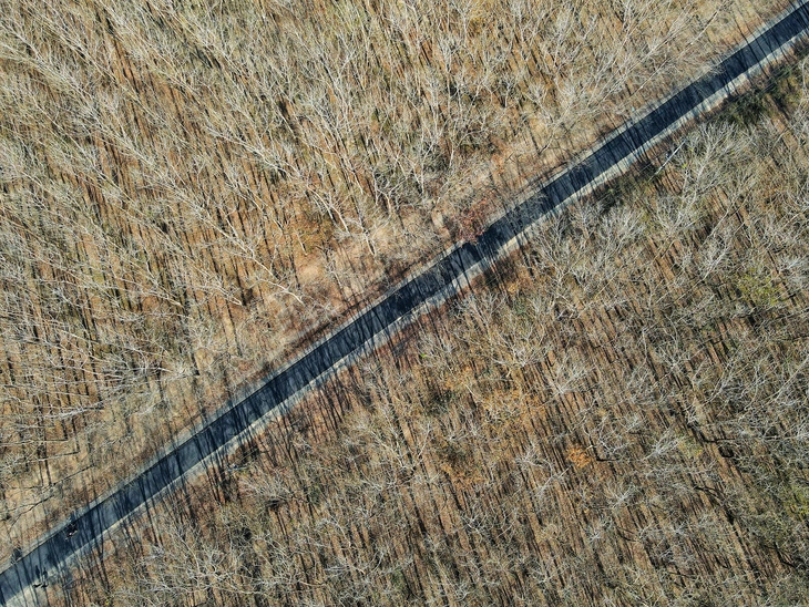 Vẻ đẹp của cao su mùa thay lá càng hiện rõ trên những con đường uốn lượn giữa rừng. Nhìn từ trên cao, những hàng cây thẳng tắp tạo thành dải màu đan xen giữa ruộng nước, hồ đập và những mảng xanh còn sót lại.