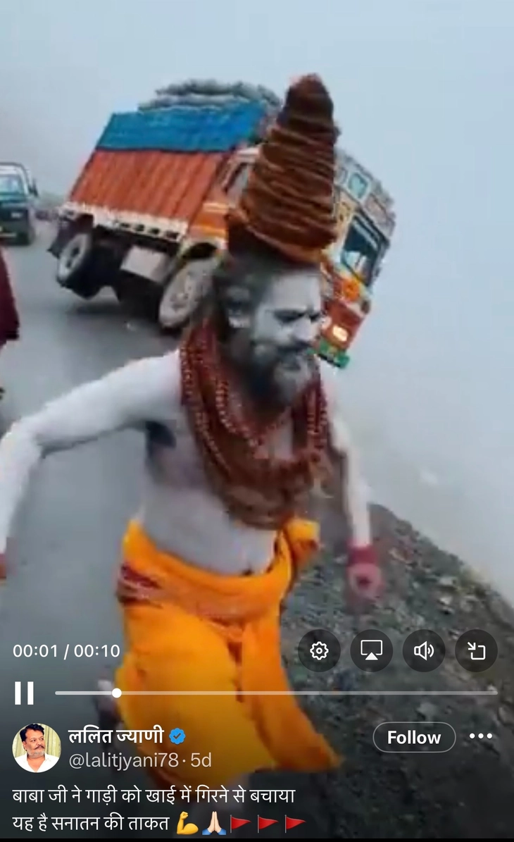 Một đoạn video đăng tải trên mạng xã hội X về một nhà sư đứng bên đường, giơ tay như đang truyền năng lượng, khiến chiếc xe tải dừng lại sát mép mương và chỉ ra rằng đây là sức mạnh của Sanatan - Ảnh: X/@lalitjyani78