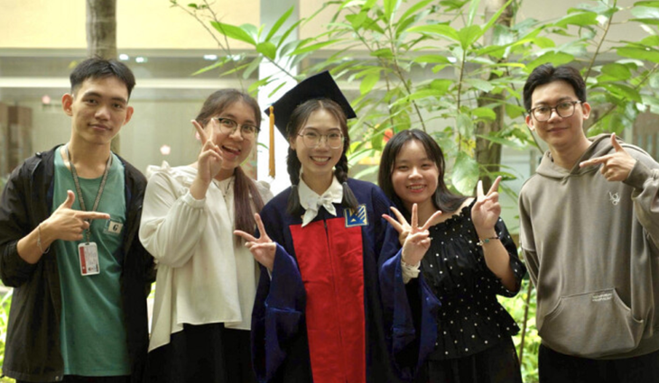Trương Thảo My (thứ ba từ trái sang) thấy hạnh phúc khi lễ tốt nghiệp của mình đã cùng lan tỏa tinh thần sẻ chia đến người xung quanh - Ảnh: NVCC