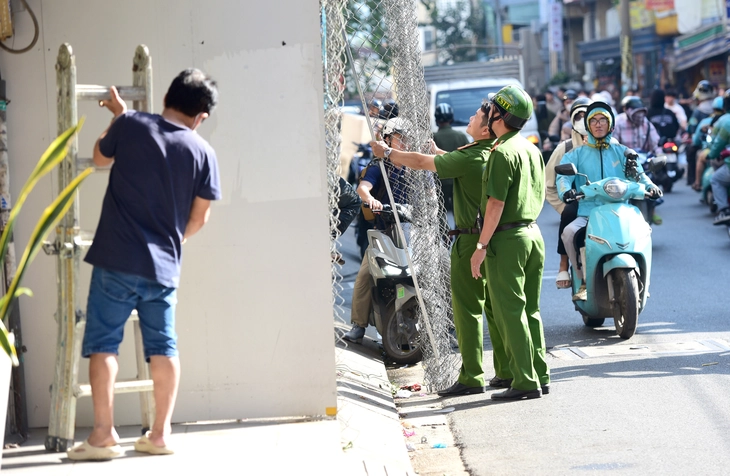 Công an phường Thạnh Mỹ Tây (quận Bình Thạnh trước đây) xử lý sai phạm ở các tuyến đường “nóng” về lấn chiếm vỉa hè sáng 21-1 - Ảnh: LÊ PHAN
