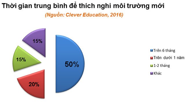 Một số em (khoảng 15%) có thể vượt qua sự khác biệt này trong một thời gian ngắn (1 - 2 tháng), phần lớn các em (trên dưới 50%) phải mất trên 6 tháng để thích nghi. Đặc biệt, có khoảng 15-20% các em phải mất trên dưới 1 năm để hoà nhập với tiến trình diễn ra hết sức chậm chạp và khó khăn. Mặc dù ở tất cả các trường trung học tại nước ngoài đều có bộ phận hỗ trợ học sinh, nhưng vì rào cản ngoại ngữ, văn hoá, hầu hết các em đều khó tận dụng được sự hỗ trợ này. Vì vậy, gia đình và bản thân các em cần sự hỗ trợ từ những chuyên gia giáo dục người Việt có kinh nghiệm trong cả hai môi trường giáo dục, Việt Nam và nước ngoài.