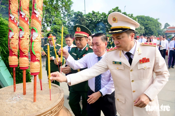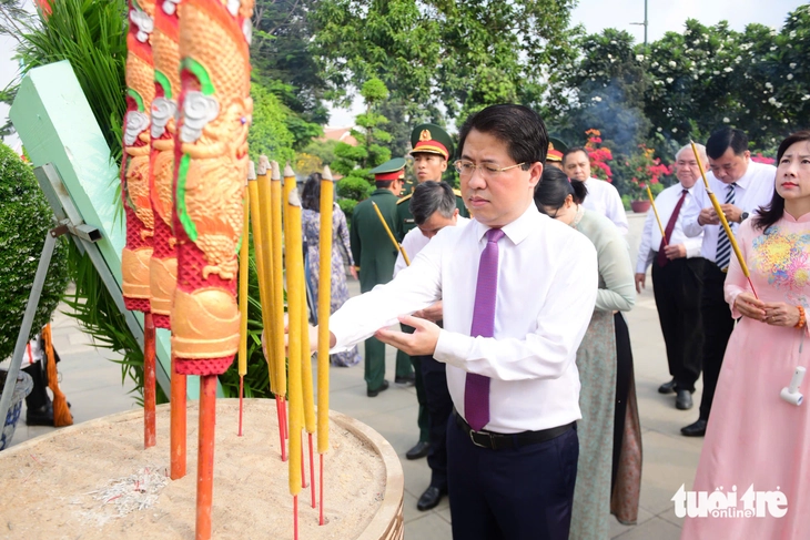Đoàn đại biểu TP.HCM do Ủy viên Trung ương Đảng, Ủy viên Trung ương Đảng, Phó bí thư Thành ủy, Chủ tịch HĐND TP.HCM Võ Văn Minh làm trưởng đoàn dâng hương tại Nghĩa trang liệt sĩ tỉnh Bình Dương (phường Thuận Giao) - Ảnh: T.T.