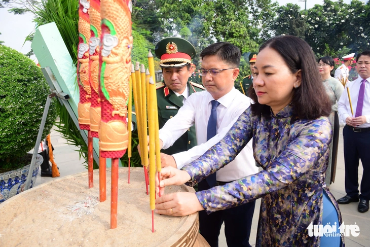 Đoàn đại biểu TP.HCM do Phó bí thư Thành ủy TP.HCM Văn Thị Bạch Tuyết làm trưởng đoàn dâng hương, dâng hoa tại Đền tưởng niệm liệt sĩ Bến Dược (xã An Nhơn Tây) - Ảnh: N.B.