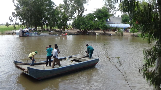 Sau đó một nhóm khoảng 15 người đã xuống chiếc trẹt (dài khoảng 3m, ngang 1,5m, thường dùng ở vùng sông nước miền Tây) để qua kênh 13.
