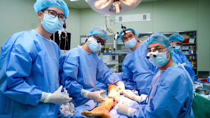 Ca mổ được triển khai với sự phối hợp của nhiều chuyên khoa, thực hiện các bước quan trọng như cắt bỏ khối u, nạo vét hạch cổ, lấy xương mác và vi phẫu tái tạo xương hàm dưới.