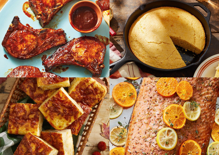 Sườn heo chiên không dầu phủ xốt BBQ bourbon, bánh mì ngô, cá hồi nướng cam... là những món ăn đem lại may mắn cho năm mới - Ảnh: Country Living